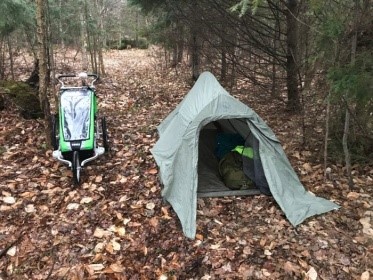 “I walked for 10 hours 25 minutes today, well over my goal of 8 hours. I think I walked a solid 60 kms because it’s only 30 kms to Truro, which I optimistically hoped I could walk in two long days. I ended up with a couple of blisters, one which burst and was quite painful. I stopped and dressed it to prevent infection. The police visited me to check in. There was a complaint because someone thought I had a child in the stroller and was walking on a busy highway. I have the support of the police now all the way to Quebec. It didn’t hurt that when I was asked for ID, I produced my veteran’s card.”